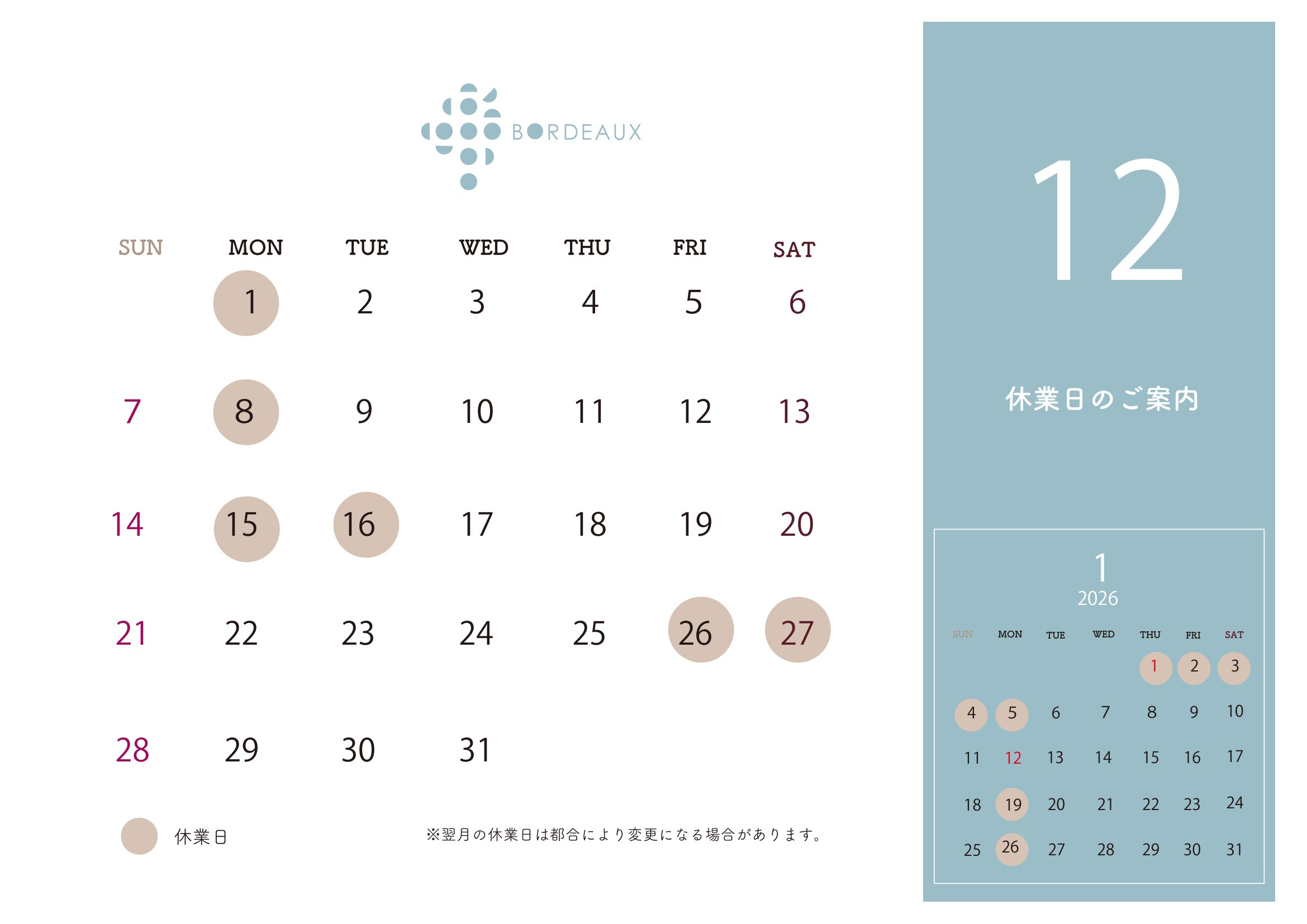 2025年12月 定休日のお知らせ